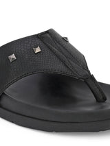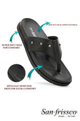 | Cornell Black Thong Slippers with Stud Detailing and Arch Support. Handcrafted with High Quality Faux Leather Upper & Lining, PU Sole. Only Grade-A quality materials used. San Frissco shoes are all handcrafted to perfection by expert artisans to offer a truly luxe and affordable experience. Hence, each shoe will have a unique hue and polish, and the color may differ slightly from the picture. |