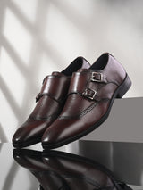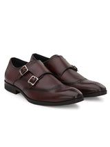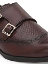 Mitchell Brown Double Monk Strap Shoes with Textured Panels and Brogue Detailing. Handcrafted with Italian Leather Textured Upper, Faux Leather Lining & TPR Out Sole. Only Grade-A Leather used. San Frissco Luxor shoes are hand-finished and couture-level creations. Hence, each shoe will have a unique hue and polish, and the color may differ slightly from the picture. |