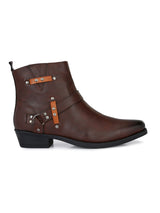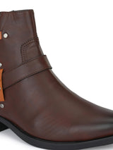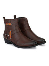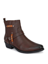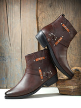 Saint High-Ankle Cuban Boots In Brown. Handcrafted with High Quality Faux Leather Upper, Lining & TPR Sole. Only Grade-A quality materials are used. San Frissco shoes are all handcrafted to perfection by expert artisans to offer a truly luxe and affordable experience. Hence, each shoe will have a unique hue and polish, and the color may differ slightly from the picture.