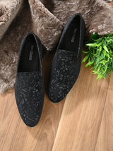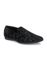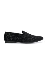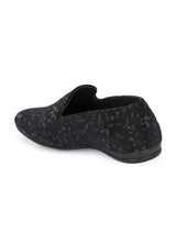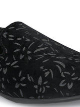 Baoli Black Textured Slip-Ons with Cutwork Pattern.