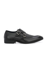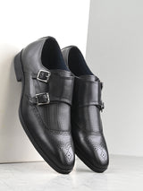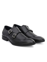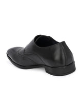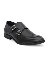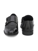 Mitchell Black Double Monk Strap Shoes with Textured Panels and Brogue Detailing. Handcrafted with Italian Leather Textured Upper, Faux Leather Lining & TPR Out Sole. Only Grade-A Leather used. San Frissco Luxor shoes are hand-finished and couture-level creations. Hence, each shoe will have a unique hue and polish, and the color may differ slightly from the picture. |