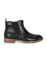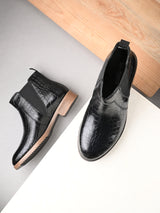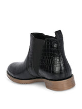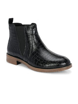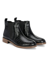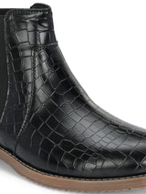Savanna Black Mid-Top Boots with Croco Textured Upper & Cushioned footbed. Handcrafted with High Quality Faux Leather Upper, Lining, Inner Soles & Textured and patterned TPR outsole. Only Grade-A Quality materials are used. San Frissco shoes are all handcrafted to perfection by expert artisans to offer a truly luxe and affordable experience. Hence, each shoe will have a unique hue and polish, and the color may differ slightly from the picture.