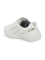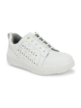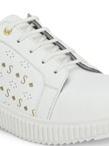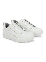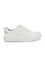 Sheen White Comfort Sneakers with Golden Accent along with Brand Embossing and a Cushioned footbed. Handcrafted with High Quality Faux Leather Upper, Lining, Inner Soles & Textured and patterned TPR outsole. Only Grade-A Quality materials are used. San Frissco shoes are all handcrafted to perfection by expert artisans to offer a truly luxe and affordable experience. Hence, each shoe will have a unique hue and polish, and the color may differ slightly from the picture.
