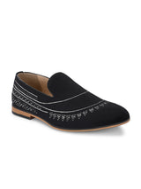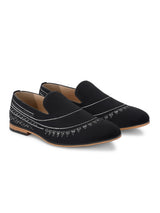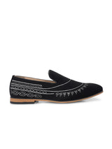 | Tribal Black Textured Slip-On Mojaris with White Thread-Work Embroidery. Handcrafted with High Quality Velvet Upper, PU Lining & TPR Sole. Only Grade-A quality materials used. San Frissco shoes are all handcrafted to perfection by expert artisans to offer a truly luxe and affordable experience. Hence, each shoe will have a unique hue and polish, and the color may differ slightly from the picture. |