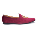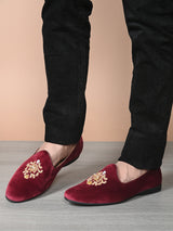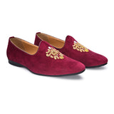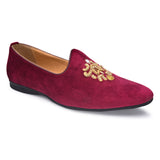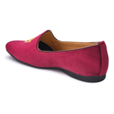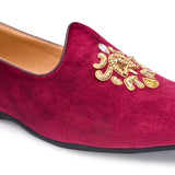 Royal Monarch Hand Embroidered Slip-Ons in Cherry-Red. Handcrafted with Italian Leather Upper Genuine Leather Lining , Inner Soles & TPR Sole. Only Grade-A Leather used. San Frissco Luxor shoes are hand-finished and couture-level creations. Hence, each shoe will have a unique hue and polish, and the color may differ slightly from the picture.